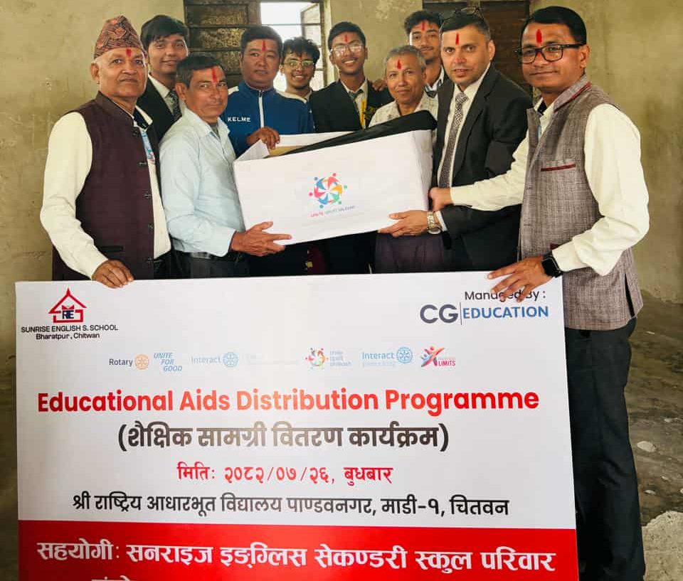 आज एक समारोहका बीच चितवनको माडी नगरपालिका वार्ड नं. १ पाण्डवनगरमा रहेको राष्ट्रिय प्राथमिक विद्यालयका छात्रछात्रालाई भरतपुर महानगरपालिका वार्ड नं. ४ पिपलचोकस्थित सनराइज इङ्गलिस स्कुलका विद्यार्थीहरुले स्टेसनरी सामान वितरण गरेका छन्। पाण्डवनगरका ८० जना छात्रछात्रालाई कापी, कलमलगायतका स्टेसनरी सामान हस्तान्तरण गरेको छ। उक्त कार्यक्रममा विद्यालयका शिक्षक, कर्मचारी, व्यवस्थापन समितिका सदस्यहरु, स्थानीय अभिभावकहरु पनि उपस्थित रहेका थिए।